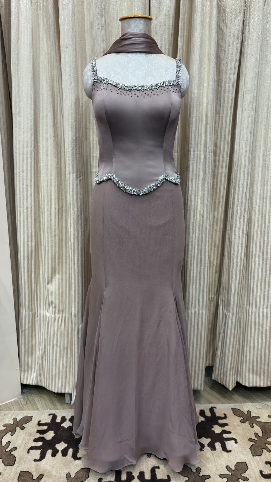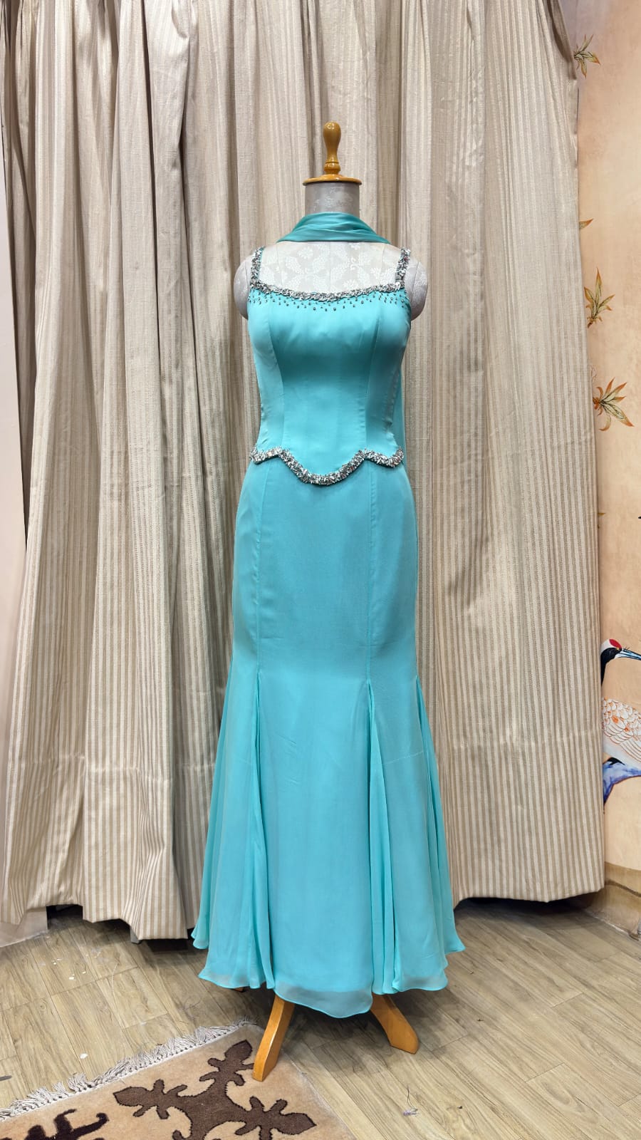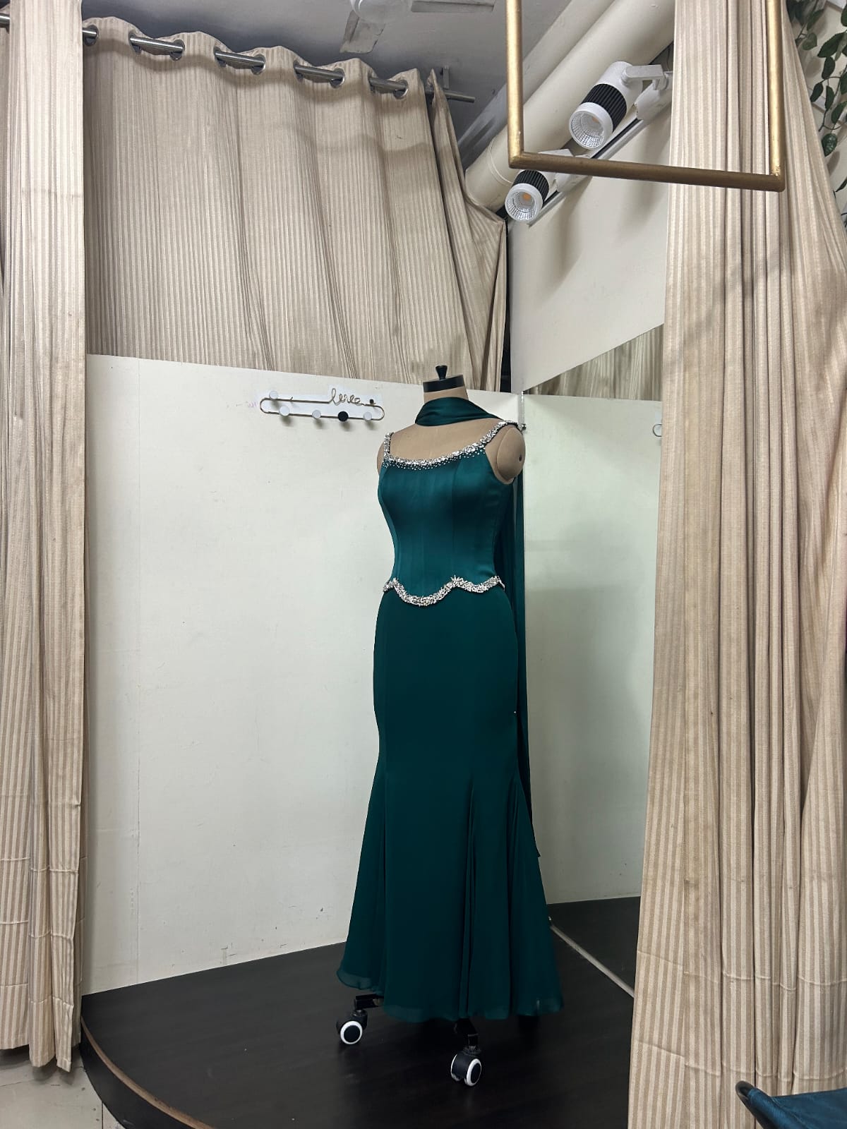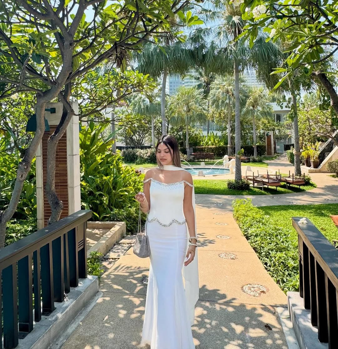 Influencer Payal Dhare in Evable's beautiful flowy dress bringing back the early 2000s Bollywood glam, embellished with stones on crystals giving it a mermaid look.