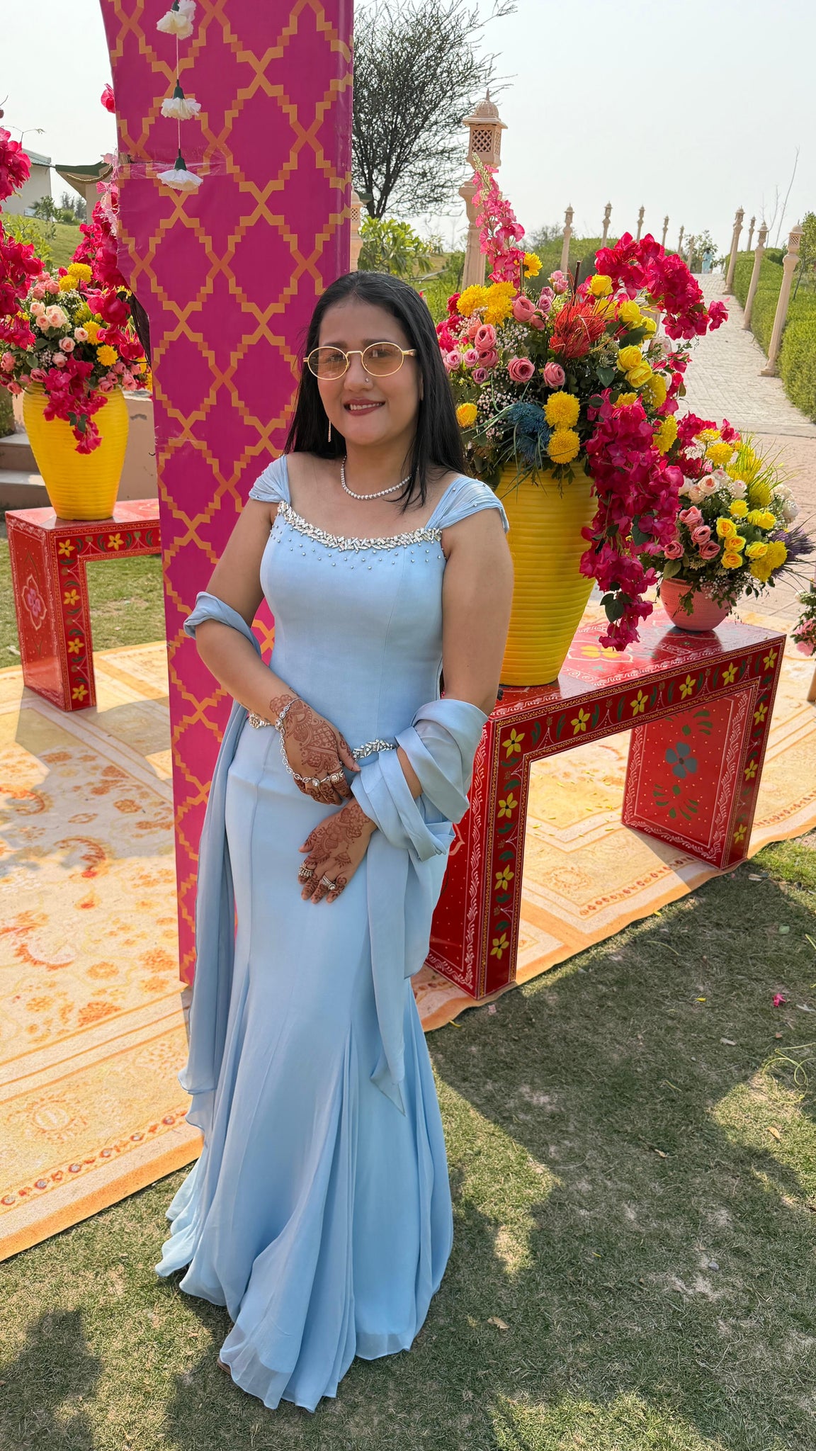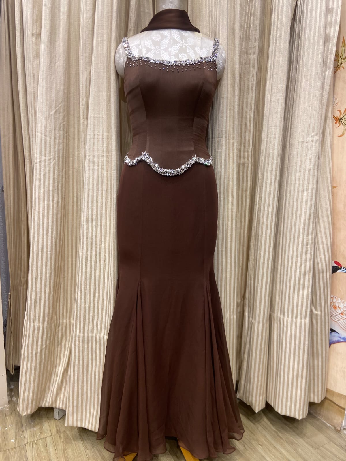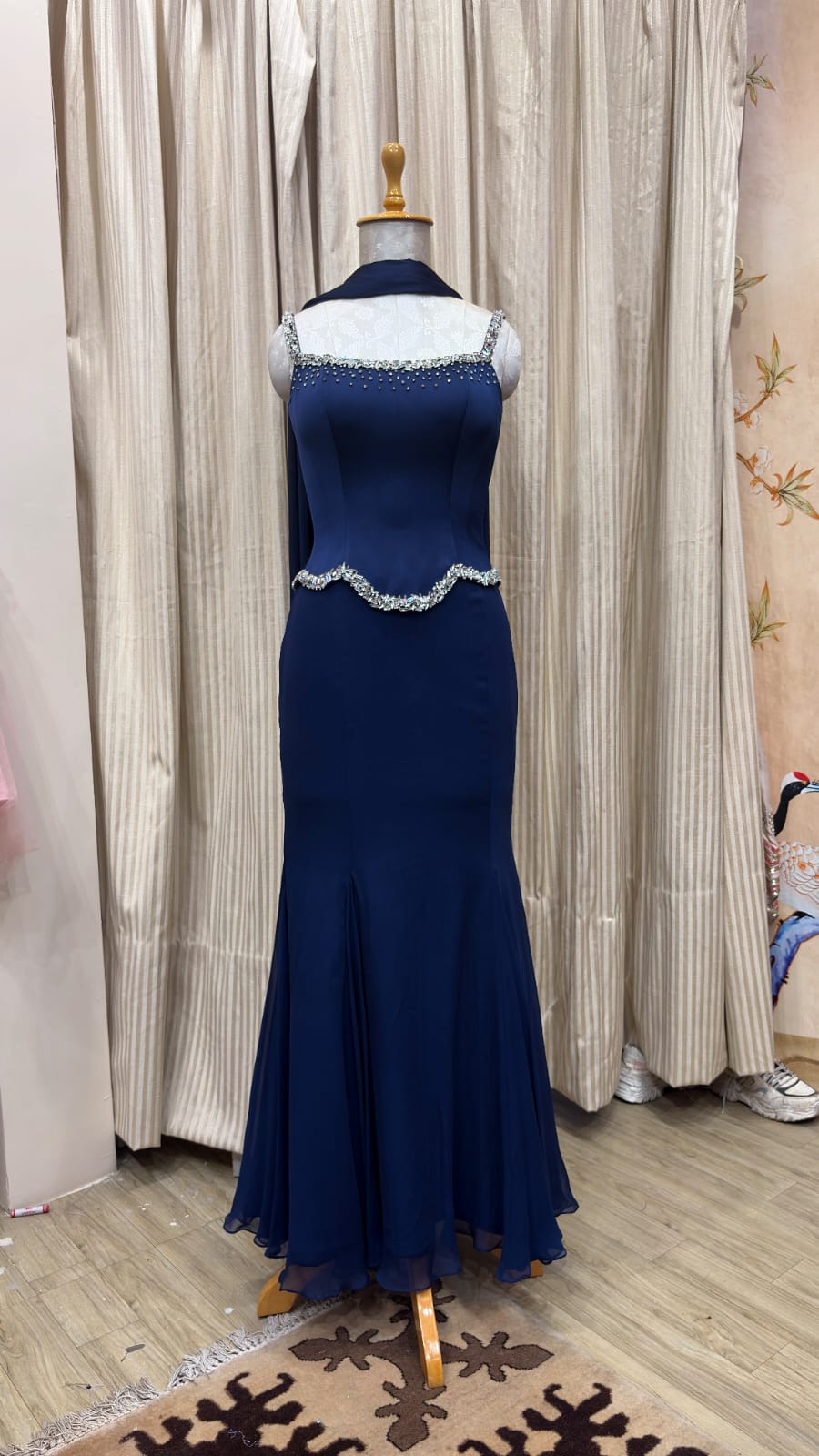 Influencer Payal Dhare in Evable's beautiful flowy dress bringing back the early 2000s Bollywood glam, embellished with stones on crystals giving it a mermaid look.