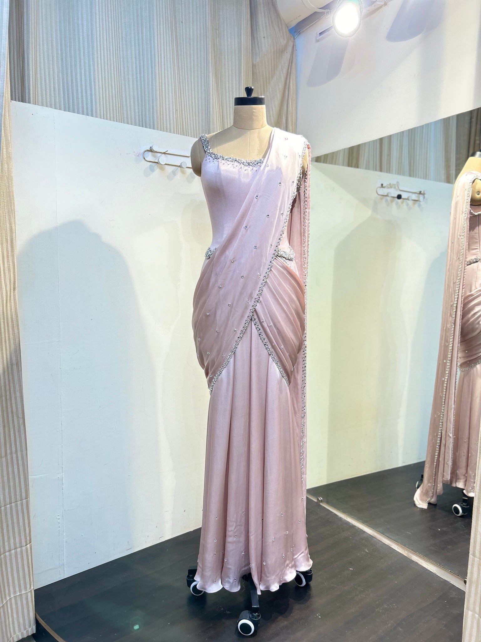 Lehenga Saree paired up with our popular hand embellished crystal scallop Corset. This ensemble builds upon the corset lehenga design, featuring a crystal-embellished pallu. It exudes an elegant, feminine apsara-inspired charm.